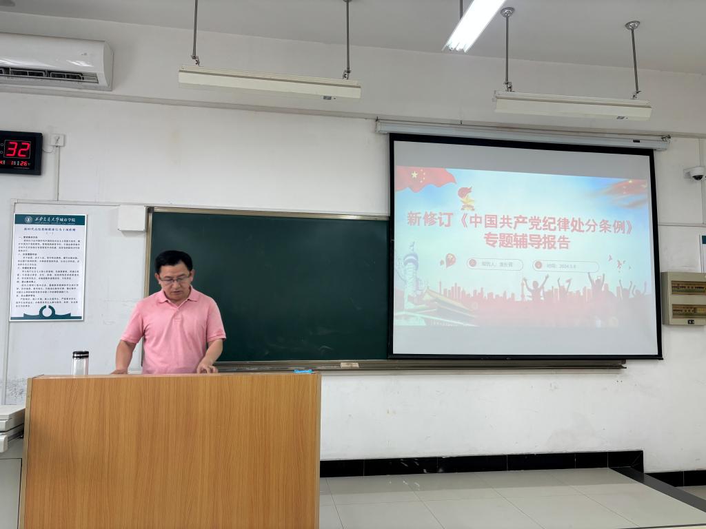 为深入开展党纪学习教育,加强党的纪律建设、增强党员的政治觉悟和纪律意识,5月8日下午,开云kaiyun官方网站教工党支部在教学楼B316开展支部书记讲党课活动,支部书记袁长普为全体党员讲授主题教育专题党课,学习贯彻新修订的《中国共产党纪律处分条例》。