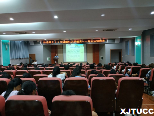 9月9日下午,开云kaiyun官方网站外语系组织全体2019级新生在学院F100报告厅开展新生入学专题教育活动。外语系主任郭继荣教授,副主任赵永生副教授,主任助理徐素云老师,英语类专业和日语专业全体教师、班主任、辅导员以及2019级新生参加会议。外语系主任郭继荣教授为同学们做了专业认知教育专题讲座。