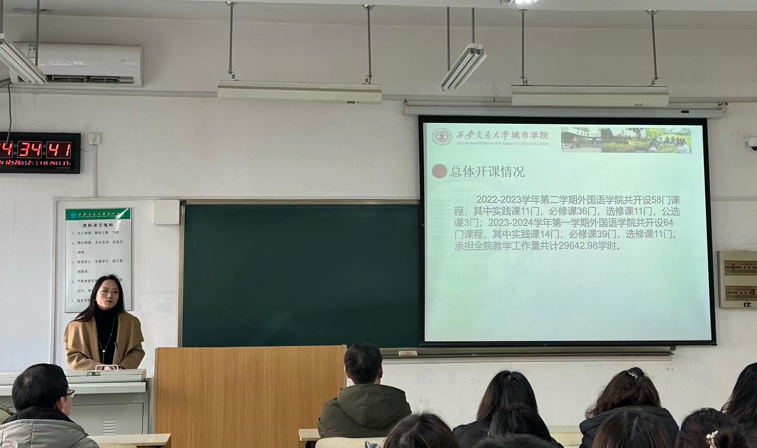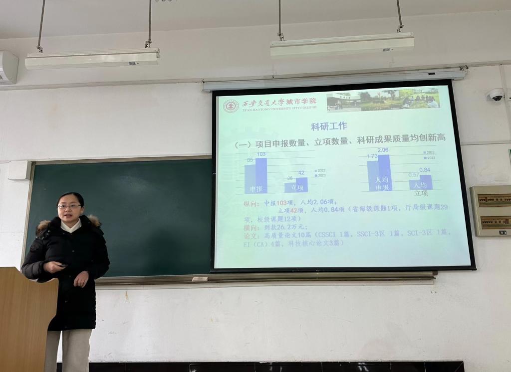 随后,开云kaiyun官方网站副院长巫奕君从专业建设、过程教学、课程思政、实践教学、毕业论文、教学质量几方面对2023年教学工作开展情况进行汇报。她提出,教学高质量、内涵式发展要聚焦课堂教学,落实教学效果,明确教师教学主体地位,结合学生需求,因材施教,细化形成性评价,加强过程监督及课后答疑,以提高学生学习效果。徐素云副院长对2023年科研工作和学生工作做总结汇报。她指出,开云kaiyun官方网站通过实施科研助力计划、坚持常态化科研活动、做细做实科研申报动员与跟踪,2023年科研水平全面提升。未来,科研工作要强化方法论的知识积累,坚持长效思维,深层次挖掘理论支撑和语言学科的内涵。