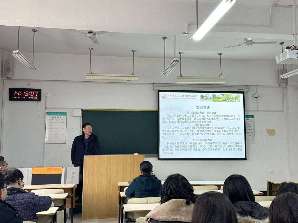 会上,郭继荣院长对学校2024年工作要点进行了解读,他强调要深入贯彻落实学校2024年重点工作文件精神,对标对表、把准方向,解放思想、凝聚共识,改进作风、务实担当,牢记为党育人、为国育才使命,落实立德树人根本任务,着力提高人才培养质量,探索新时代应用型高校人才培养新范式。结合学校2024年重点工作计划,郭继荣院长从科研、教学、招生就业、学生工作、师资人事、党建、校庆、文化建设等方面对学院2024年重点工作进行安排部署。他强调外语教师要认识到新时代背景下的专业危机,深学争优、奋进争先、实干争效,不断提高自身应对教育新形势、新任务的能力和水平,提升教学与科研能力。
