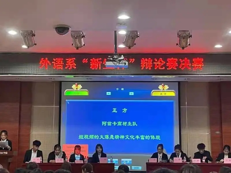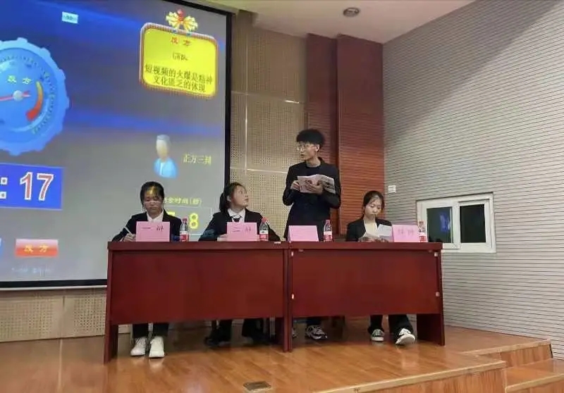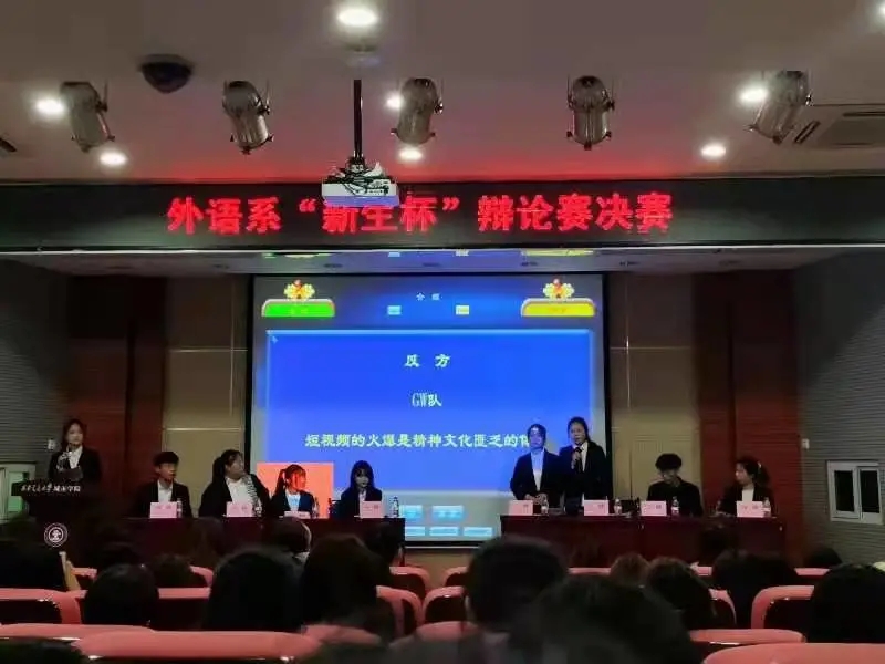 经过前期淘汰赛激烈的角逐,日语2101班和英语2103班脱颖而出,在决赛场上一决高下。围绕着本次决赛的辩题——“短视频的火爆是精神文化丰富还是匮乏的体现”,两支队伍各执一词,从不同层面剖析了短视频之于精神文化的作用。双方选手就各自的观点提出了分析和见解,辩论内容富有内涵,角度新颖,发人深思。在论辩的各个环节中,辩手们引经据典、唇枪舌战,妙语连珠的辩论一次次将比赛推向高潮,赢得了台下阵阵掌声。