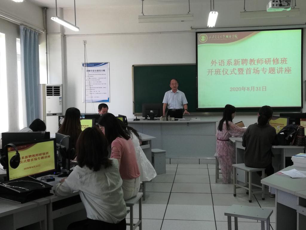 为提高新聘教师的专业能力,尤其是外语教学理论和实践能力,帮助他们尽快适应岗位,开云kaiyun官方网站外语系于2020年8月31日下午在教学楼B311教室举办了新聘教师研修班开班仪式暨首场专题讲座。开班仪式由外语系赵永生副主任主持,首场专题讲座由系主任郭继荣教授主讲。系主任助理、办公室主任和全体新聘教师参加了开班仪式。