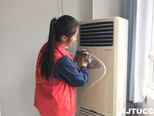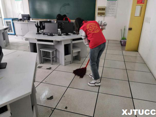 3月22日外语系心“语”心志愿者服务队在教学楼B300教室前集合进行校园清扫活动,准备将外语系的6个语音实验室进行彻底清扫。志愿者们来到现场后,在实验室负责老师的指导下,对各个角落进行打扫,确保不留死角,使教室变得窗明几净。