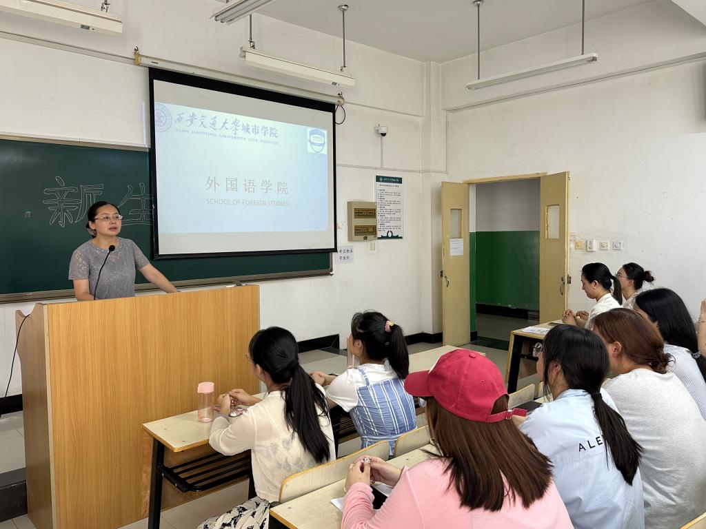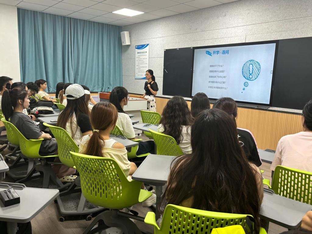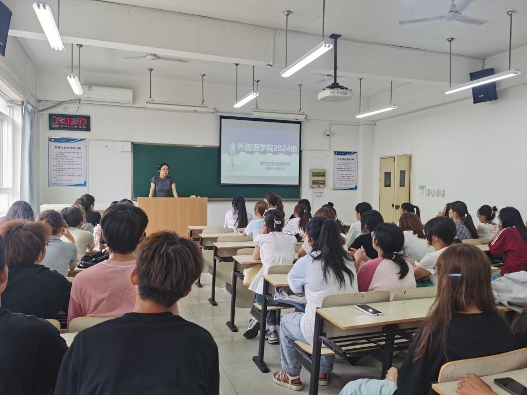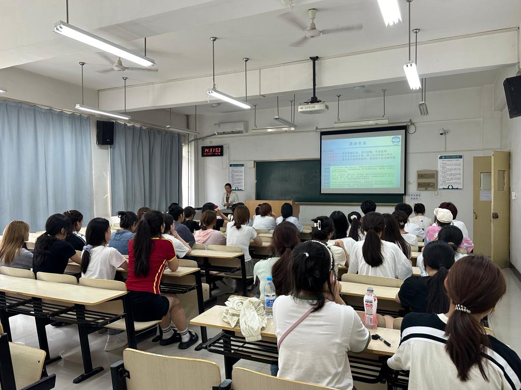 为帮助新生快速融入大学生活,韩蓉就学生违纪处理办法、请假考勤制度、课内外学分认定要求等进行详细的讲解,韩老师希望所有新生充分认识到拥有自己独特的一面是一件值得骄傲的事,学会悦纳自我,学会独立勇敢。外国语学院英语系副主任张一帆老师从学习方式变化、良好学习习惯养成、三证考取等方面入手,为新生提供学业和职业指导,叮嘱大家要分年级、分阶段制定合理有效的学习计划,有目标的学习专业知识,不断提升专业能力素养,为日后考研、求职奠定良好基础。