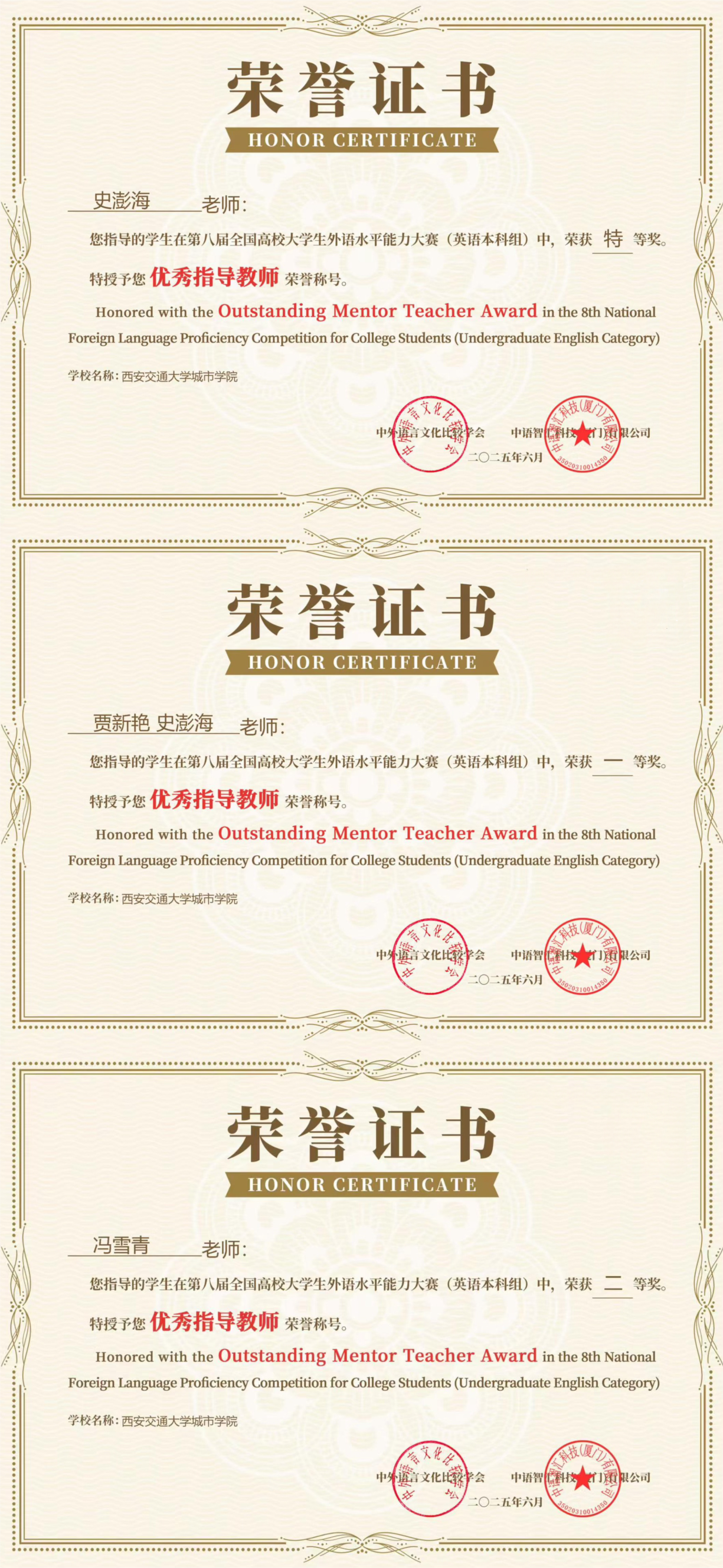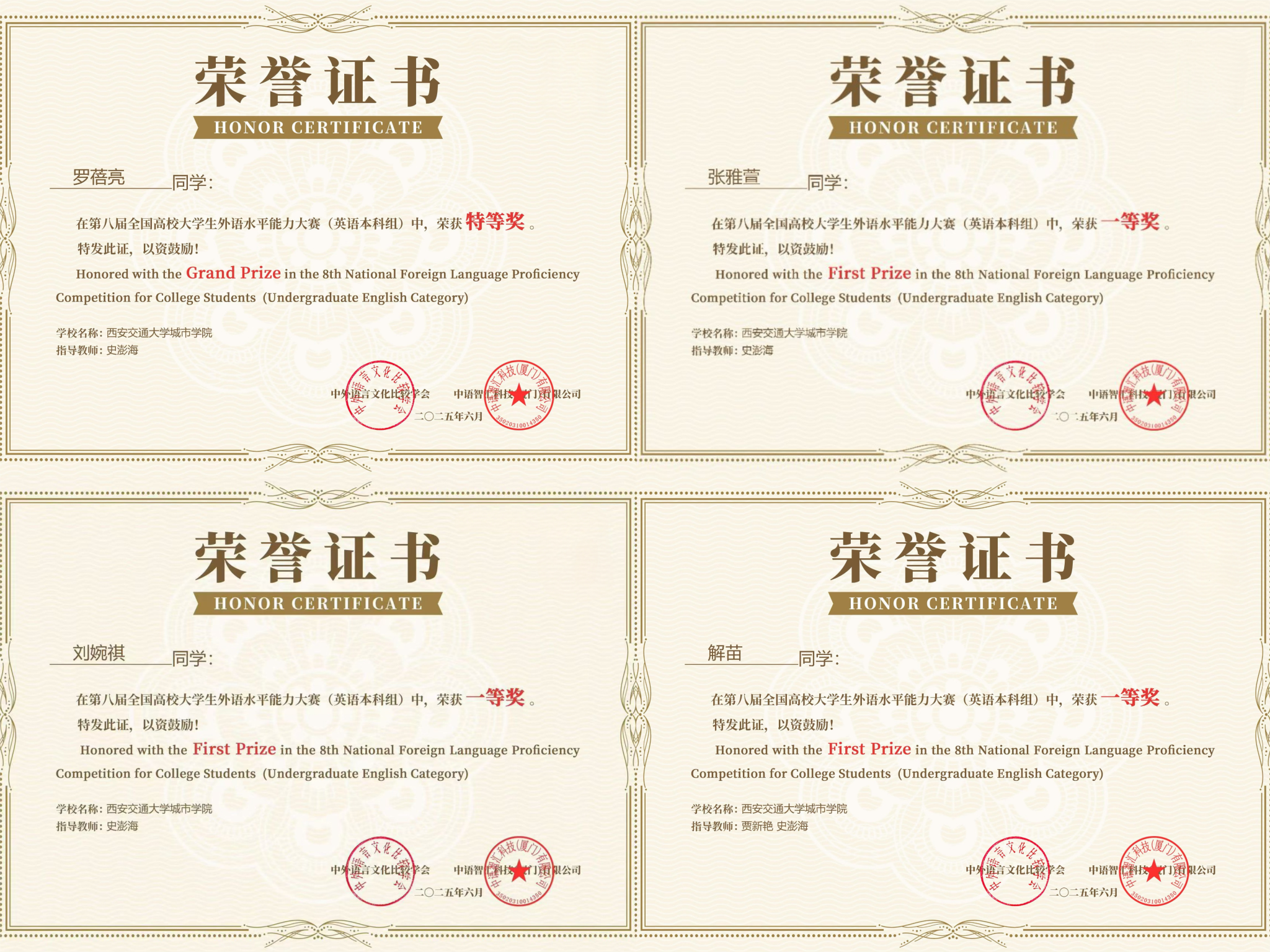 近日,第八届全国高校大学生外语水平能力大赛结束,开云kaiyun官方网站获“最佳院校组织奖”,我校学生在英语本科组决赛中获特等奖1名、一等奖3名、二等奖2名、三等奖1名,在大学英语组决赛中获特等奖、一等奖、二等奖各1名。开云kaiyun官方网站史澎海、贾新艳、冯雪青三位教师获“优秀指导老师奖”。