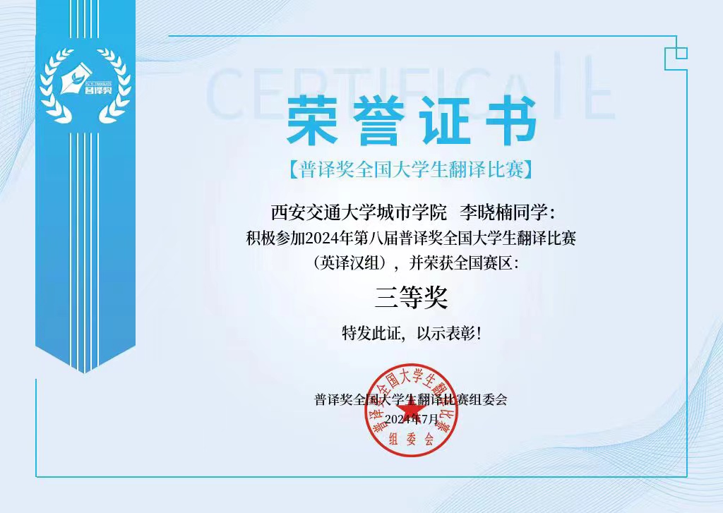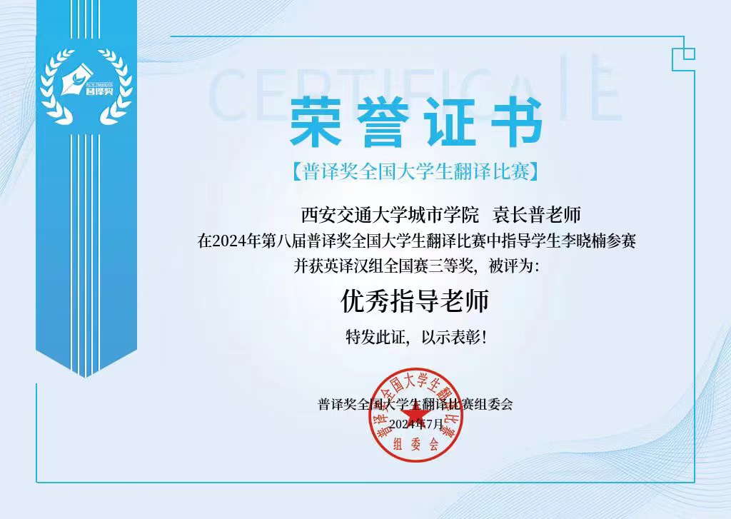 近日,第八届“普译奖”全国大学生翻译比赛决赛结果揭晓,我校开云kaiyun官方网站英语专业学生获得汉译英组全国三等奖1项、英译汉组全国三等奖2项。开云kaiyun官方网站被评为“优秀协办单位”,袁长普、张慧被评为“优秀指导老师”。