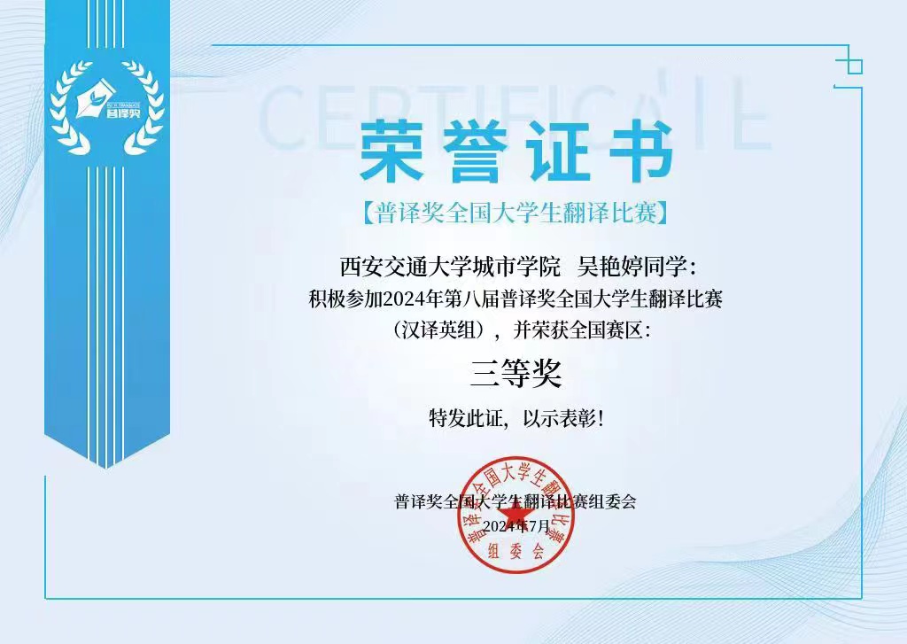 自3月中旬比赛报名始,我校开云kaiyun官方网站作为赛事协办单位就密切关注比赛进程并有序组织赛事宣传。比赛期间,开云kaiyun官方网站英语专业学生发挥出色,吴艳婷同学荣获汉译英组全国赛三等奖,蔡政熹、李晓楠同学荣获英译汉组全国赛三等奖。