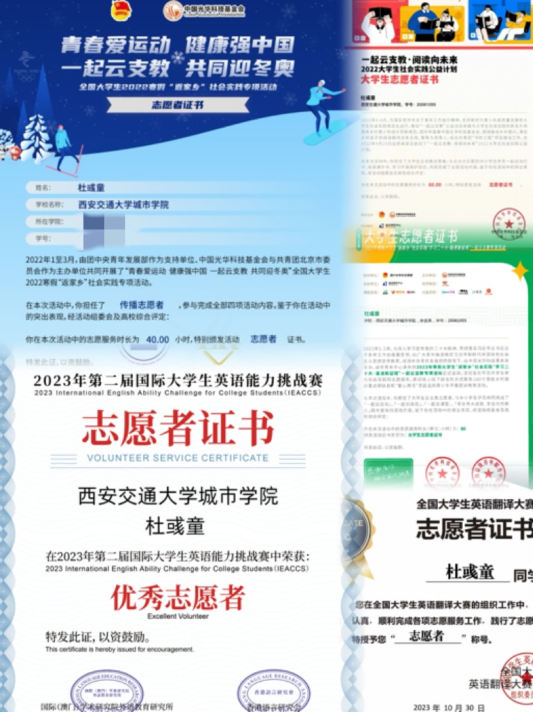 通过一系列的社会实践活动,杜彧童不仅锻炼了自己的能力,还收获了成长和感动,更展现出了她作为一名优秀学生的社会责任感和奉献精神。