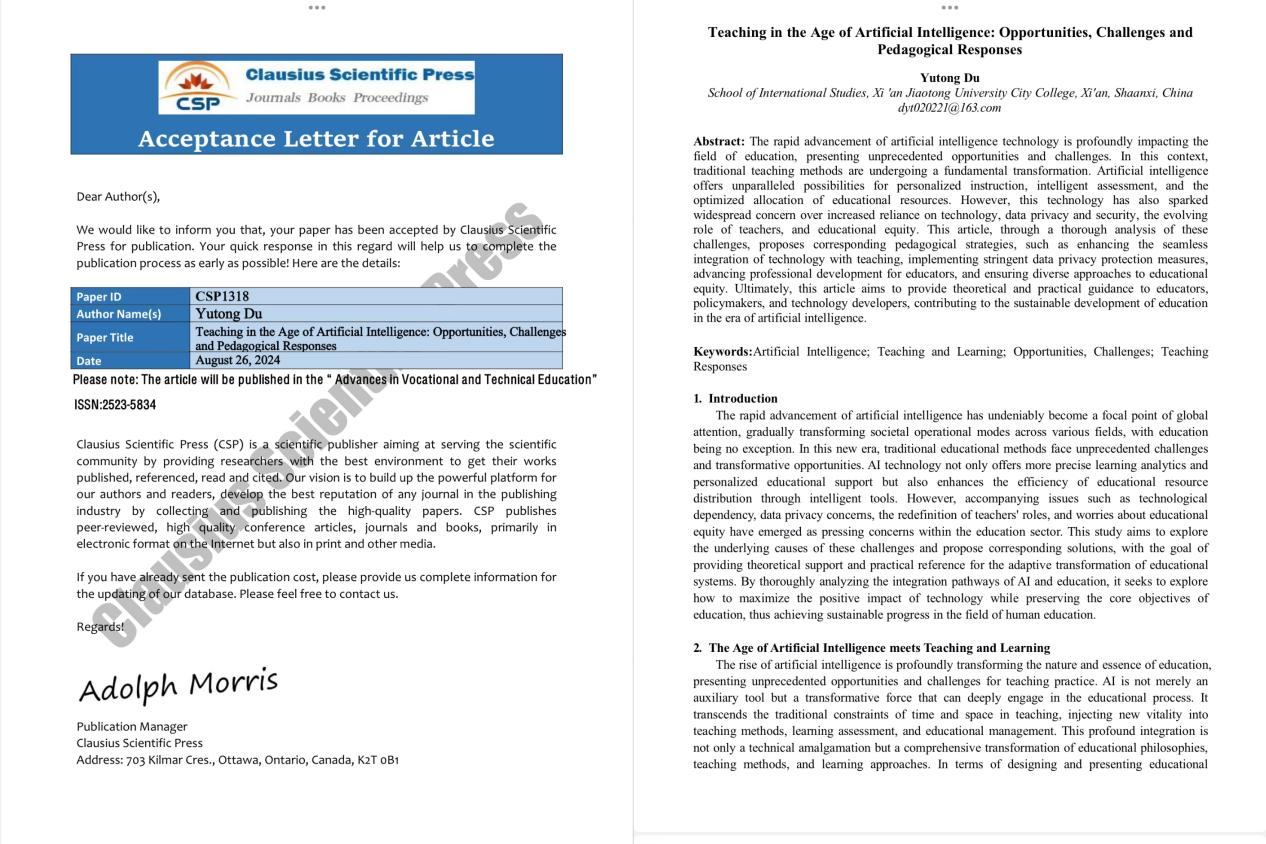 经过一次又一次的修改和完善,她的论文终于逐渐成形。从初稿到最终版本,她花费了八个月的时间。功夫不负有心人,最终她以第一作者的身份在国际期刊上发表了论文《Teaching in the Age of Artifical Intelligence:Opportunities,Challenges and Pedagogical》。与此同时,她的雅思考试也取得了令人惊喜的成绩 ——7分,写作单科更是高达7.5分。