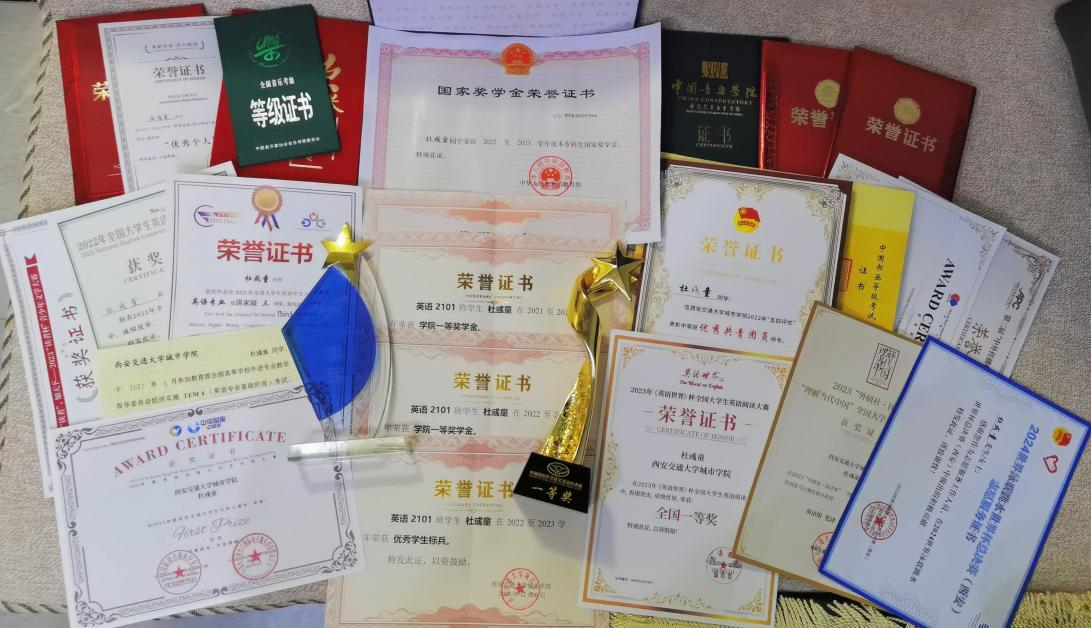 然而,杜彧童的追求并不局限于课业优秀。她像一只勇敢的海燕,毅然决然地冲出舒适的港湾,挑战自我,投身于阅读、写作和口笔译等多个学科领域的竞赛中,并在赛场上披荆斩棘,斩获众多奖项。她曾在学科竞赛中获得两项国家级一等奖、两项国家级三等奖等23项荣誉。在她看来,英语竞赛犹如一场全方位的考验,它不仅是对知识储备的检验,更是对逻辑思维能力、临场反应能力的综合考察。她常常感慨:“书到用时方恨少啊!” 而竞赛在她眼中是“以赛促学”的绝佳平台。每一次专业赛事,她都视为充实知识宝库的珍贵契机。