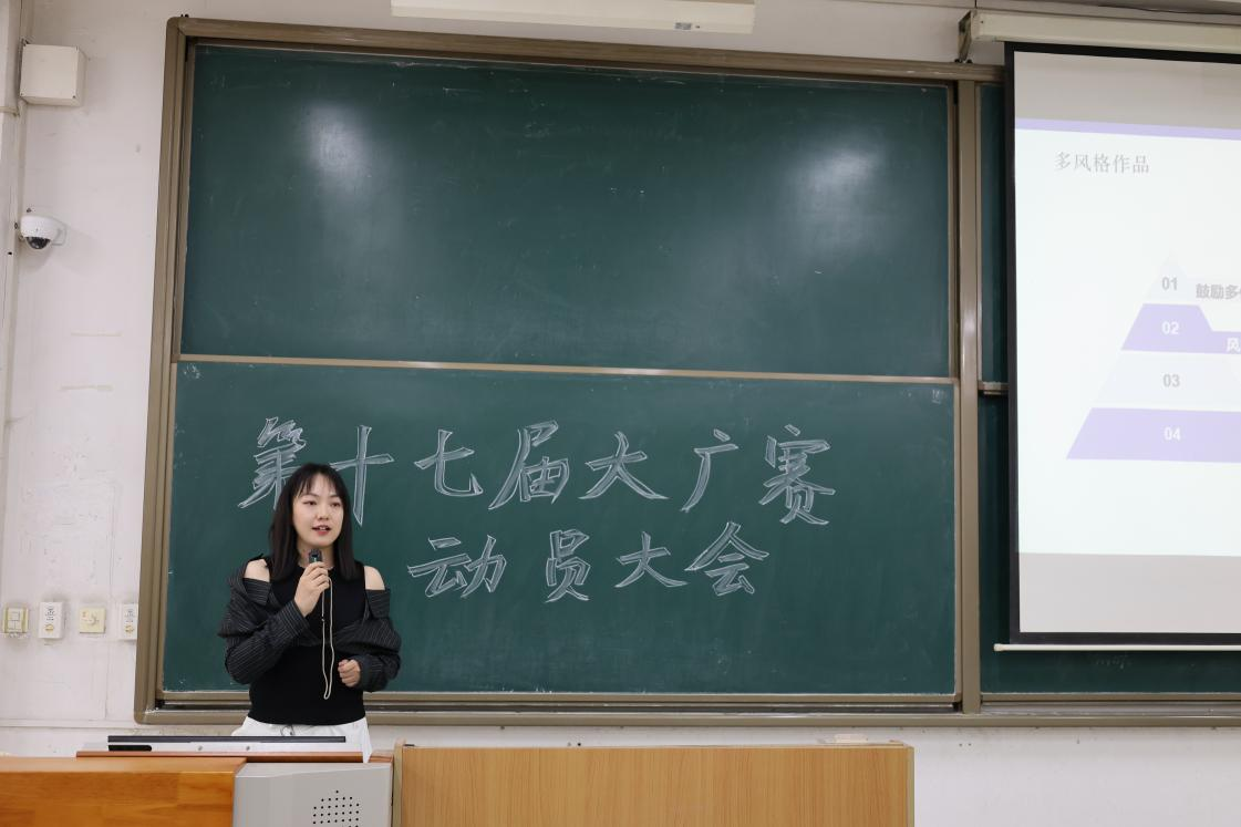 大广赛总负责人孙菡忆首先对赛事进行全方位解读,围绕大赛概况、主题口号、命题剖析、赛程规划、作品类型、本届创新点与常见问题等七个方面逐一展开。她鼓励同学们开拓视野,聚焦新兴赛道,积极探索AIGC类作品创作,同时分享了素材与问卷查找网站,并着重强调了作品提交截止时间,为同学们筑牢参赛基础。